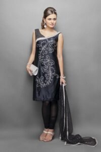Urban chic stylish black satin suit embellished with silver crystals & dimonte work