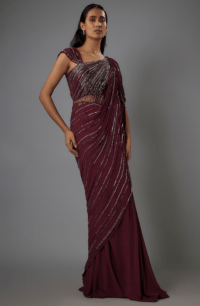 Berry Georgette Bugle Bead Embroidered Gown Saree