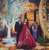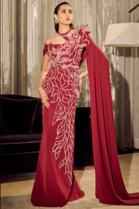 Wine Floral Zardozi and Sequins Embroidered One Shoulder Flared Gown
