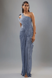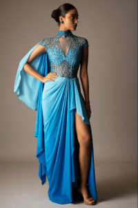 Blue Ombre Silk Crepe Embellished Draped Gown Saree