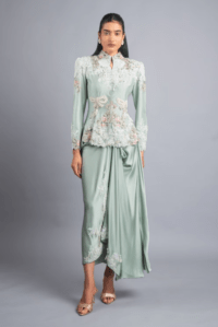 Pastel Blue Satin Silk Peplum Jacket & Skirt Set