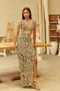 Rust Crepe Sequins Embellished Skirt Saree Set
