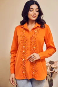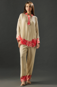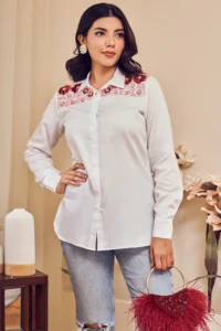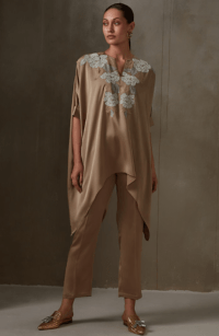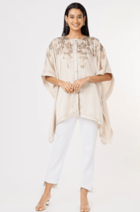 Beige Blended Cotton Thread Embroidered Batwing Shirt