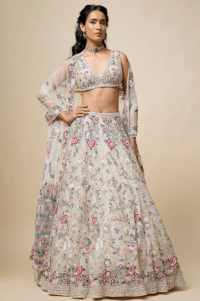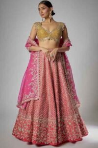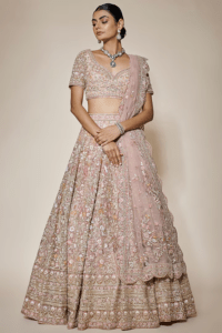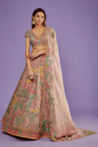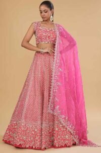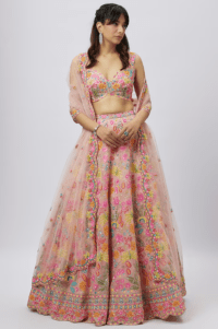 Peach Pink Net Leaf Embroidered Lehenga Set