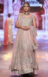 Powder pink chiffon shirt, powder pink jamawar dupatta and net lehnga.