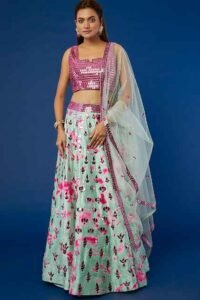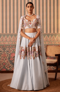 Powder Blue Silk & Organza Floral Applique Embellished Lehenga Set