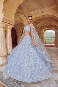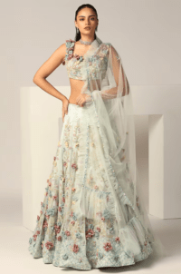 Powder blue tulle lehenga embroidered with 3D floral applique, sequins and crystals
