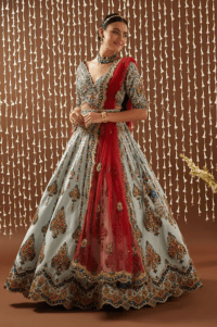 Powder Grey Organza Hand Embroidered Lehenga Set