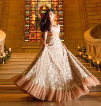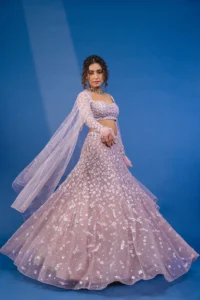 Powder pink tulle lehenga hand embroidered with sequins and crystals