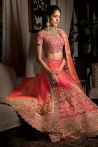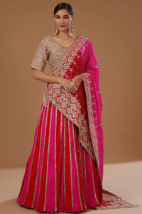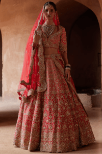 Red & Coral Ombre Raw Silk Embroidered Lehenga Set