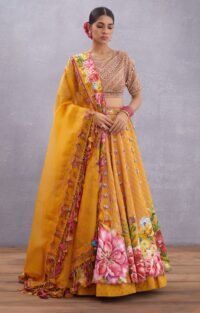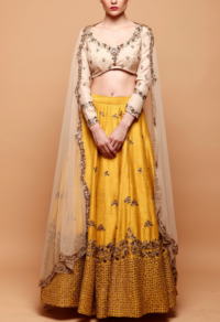 Yellow Katan Silk Thread & Metallic Hand Embroidered Lehenga Set