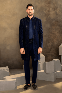 Blue Satin, Velvet Sequins Embroidered Sherwani Set