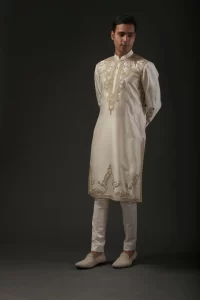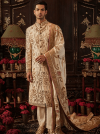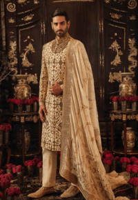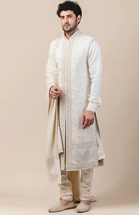 Ivory & Grey Raw Silk Thread Embroidered Wedding Sherwani