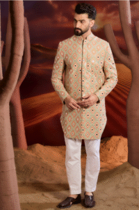 Cream Silk Mirror Embroidered Sherwani