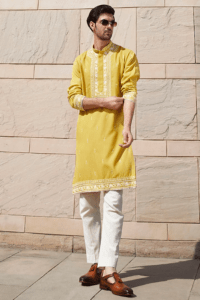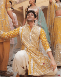 Yellow colour mens kurta with mirror work