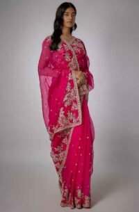 Pink Pure Organza Hand Embroidered Saree Set