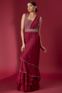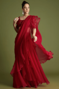 Red Chiffon Pre-Draped Ruffled Saree Set