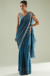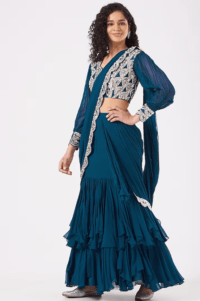 Teal Silk Georgette Pre-Draped Saree Set