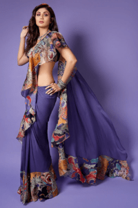 Violet Satin Organza Printed & Embellished Ruffled Saree Set