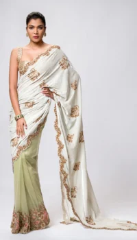 Violet Satin Organza Printed & Embellished Ruffled Saree Set