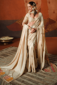 Almond Ivory Dupion Motif Embroidered Saree Set