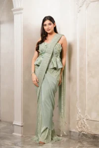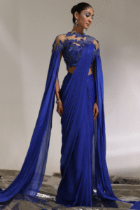 Abyss Blue Imported Satin Pre-Draped Jacket Saree Set