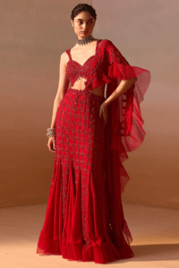 Deep Red Georgette & Organza Cutdana Embellished Pre-Draped Saree Set