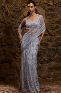 Dove Grey Net Hand Embroidered Draped Saree Set