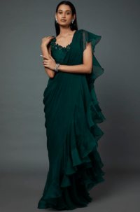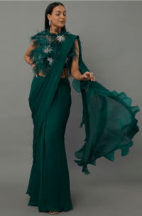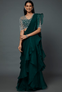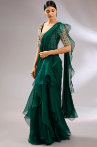 Emerald Green Chiffon & Organza Draped Ruffled Saree