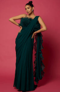 Emerald Green Chiffon Draped Ruffled Saree Set