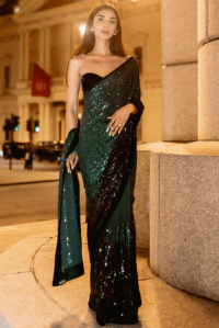 Emerald Green & Black Ombre Georgette Sequins Saree Set