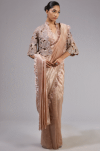 Golden Beige Crepe Zardosi Embroidered Pre-Draped Jacket Saree Set