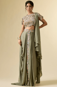 Green Crepe Hand Embroidered Draped Skirt Set