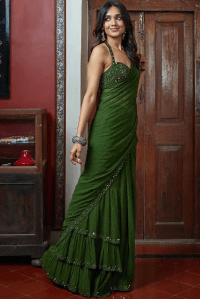 Green Hand Embroidered Tiered Saree Set
