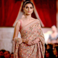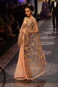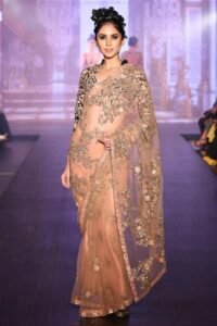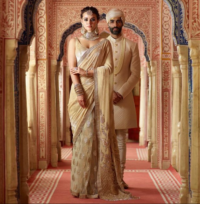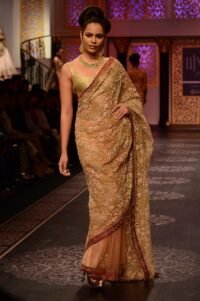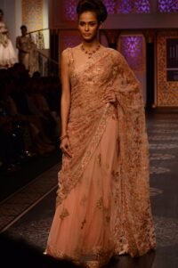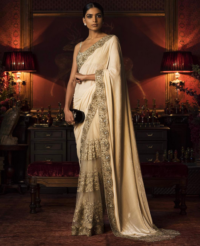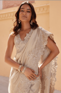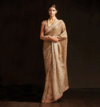 Beige Champagne Tissue Zardosi Embroidered Handcrafted Saree Set