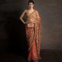 Beige and coral fully embroidered saree