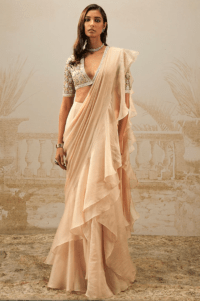 Beige Chiffon & Organza Pre-Draped Ruffled Saree Set