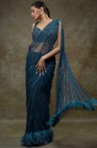 Navy Blue Organza Feather Embellished Saree Set