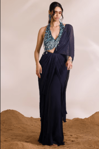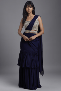 Navy Blue Georgette Pre-Stitched Saree Set