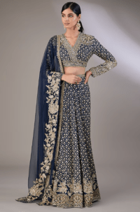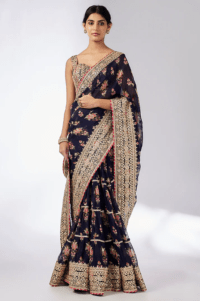 Navy Blue Organza Hand & Machine Embroidered Frilled Saree Set