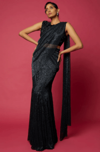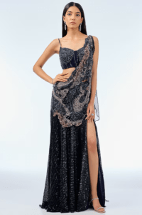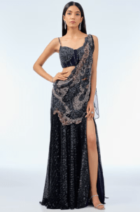 Navy Blue Sequins Draped Skirt Saree Set