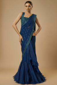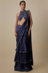 Navy Blue Organza Draped Ruffle Saree Set