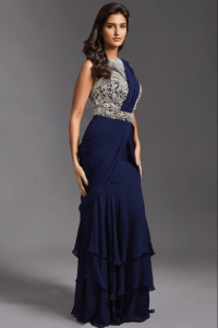 Navy Blue Georgette Ruffled Draped Saree Set