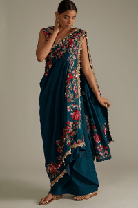 Peacock Blue Embroidered Draped Saree Set
