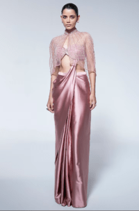 Peach Pink Pure Satin Pre-Draped Jacket Saree Set