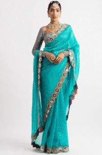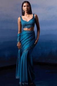 Peacock Blue Satin Sequins & Crystal Embroidered Saree Set