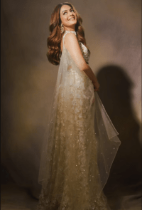 Beautiful bridal dress in shoking pink and dark purple color Model