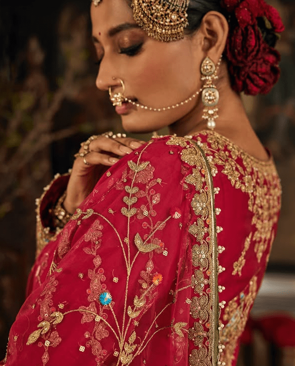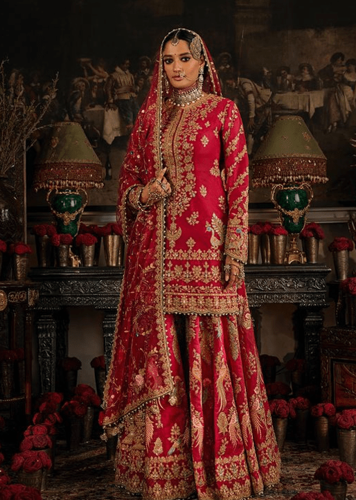 A dark earthy pink kurti-sharara, with floral and avian artworks derived from vintage textile fragments.The look is completed with an embroidered tulle dupatta.