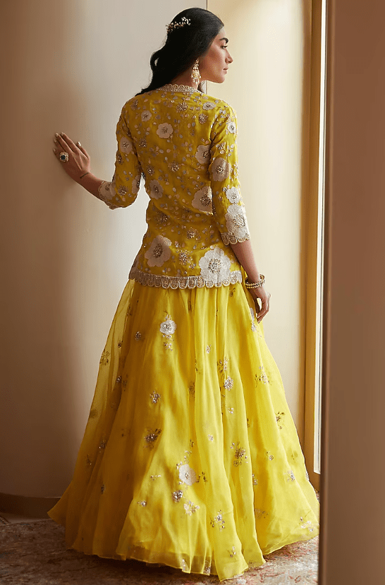 This occasion-ready yellow lehenga in organza silk is embellished with aari and applique hand embroidery detailing, complementing the look with a matching blouse having french knots. Style the look with dangler earrings and a maang tikka for the wedding ceremony. Perfect wear for a bridesmaid.