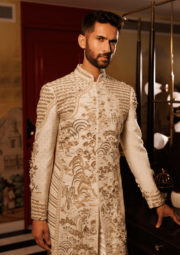 A pristine ivory sherwani intricately embellished with subtle pastel embroidery and delicate motifs. Perfect for a modern groom embracing timeless tradition.